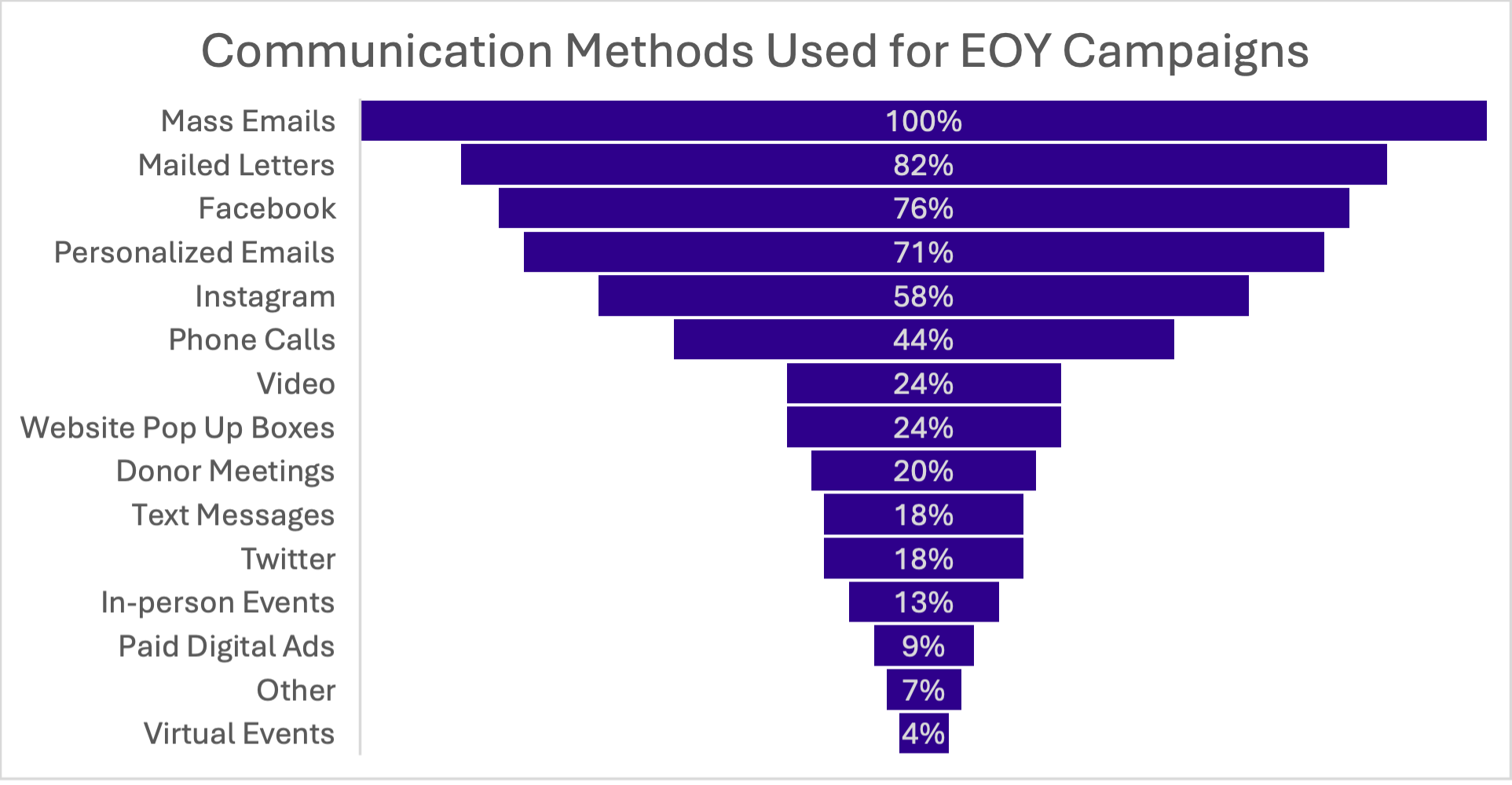 Email, direct mail, and Facebook were the most popular communication channels. We asked the Spool about the communications methods they used in their EOY campaigns. Most respondents used at a least four. Here’s a look: