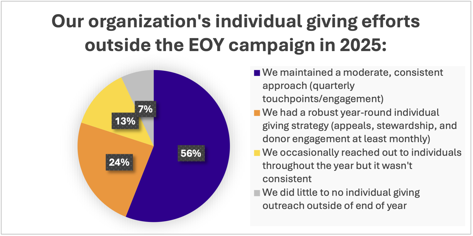 My favorite finding of all was that so many of the respondents are keeping their donors engaged consistently. Thread asked, “Which of the following best describes your organization’s individual giving efforts outside of your end-of-year campaign in 2025?.” Here’s what respondents said: